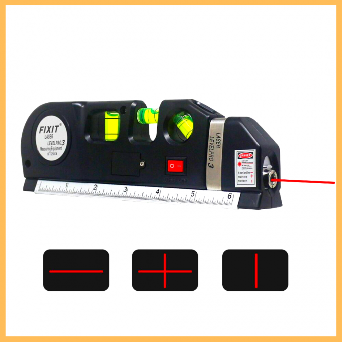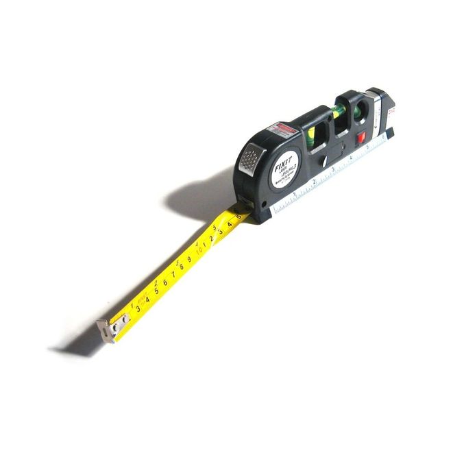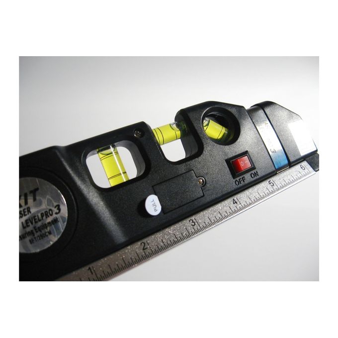 Ruban à mesurer de 250 cm de long.Trois bouteilles mécaniques intégrées avec une bulle d’air – niveaux mécaniques.Alimentation laser à partir de trois batteries de tablette (trois pièces détachées incluses).